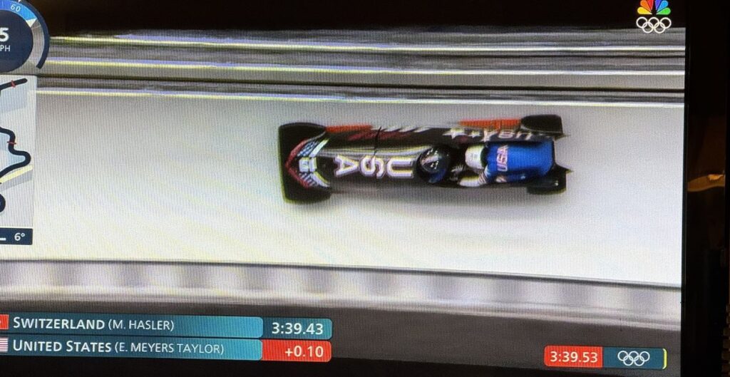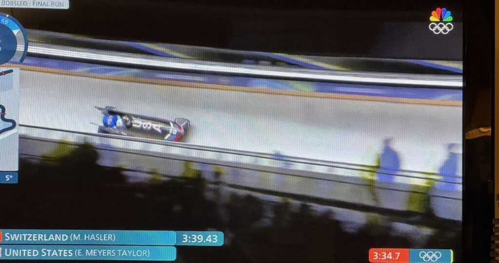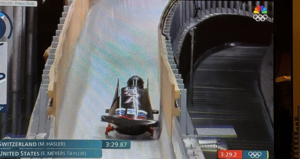 2-Woman Bobsled Race: During Run 3. Germany’s L. Nolte is in 1st, Germany’s L. Buckwitz is in 2nd, USA’s Kaillie Humphries is in 3rd, Germany’s K. Kalicki is in 4th, USA’s Kaysha Love is in 5th, Switzerland’s M. Hasler is in 6th, and Austria’s K. Beierl is in 7th place. Switzerland’s D. Annen takes over 7th place, Canada’s B. Ribi is in 10th, and USA’s Elana Meyers-Taylor is in 6th place position. In the Final Run, France’s M. Boch is in 1st place, Poland’s Weiszwski is in 2nd place, and Italy’s G. Andreutti is in 4th place position. Great Britain’s A. Nicoll takes over 1st place and Korea’s Kim Yooran takes over 2nd place. Canada’s M. Lotholz is now in 1st place, and Canada’s Cynthia Appiah is in 2nd place. China’s H. Mingming and Canada’s B. Ribi tie for 1st place position. Australia’s Bree Walker is now in 1st place, but Austria’s K. Beierl takes over the 1st place position. Switzerland’s D. Annen is now in 1st place, before Switzerland’s Hasler moves into 1st place and USA’s Meyer-Taylor is in 2nd place. USA’s K. Love makes it to 1st place, but Germany’s K. Kalicki soon takes over 1st place. USA’s K. Humphries is now in 1st place, before Germany’s L. Buckwitz moves into 1st place position. The last person to race is Germany’s L. Nolte, who makes it to 1st place position Therefore, Germany’s Laura Nolte wins Gold, Germany’s Lisa Buckwitz wins Silver, and USA’s Kaillie Armbruster Humphries wins Bronze.